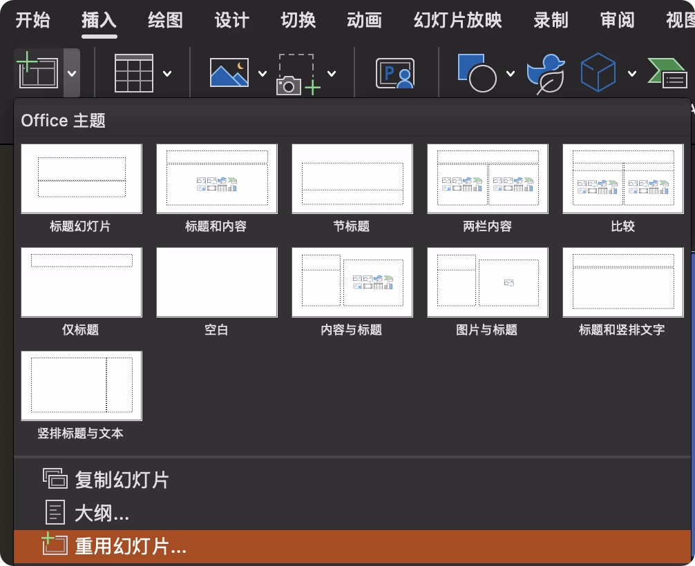 插入>幻灯片>重用幻灯片,选择想要的幻灯片